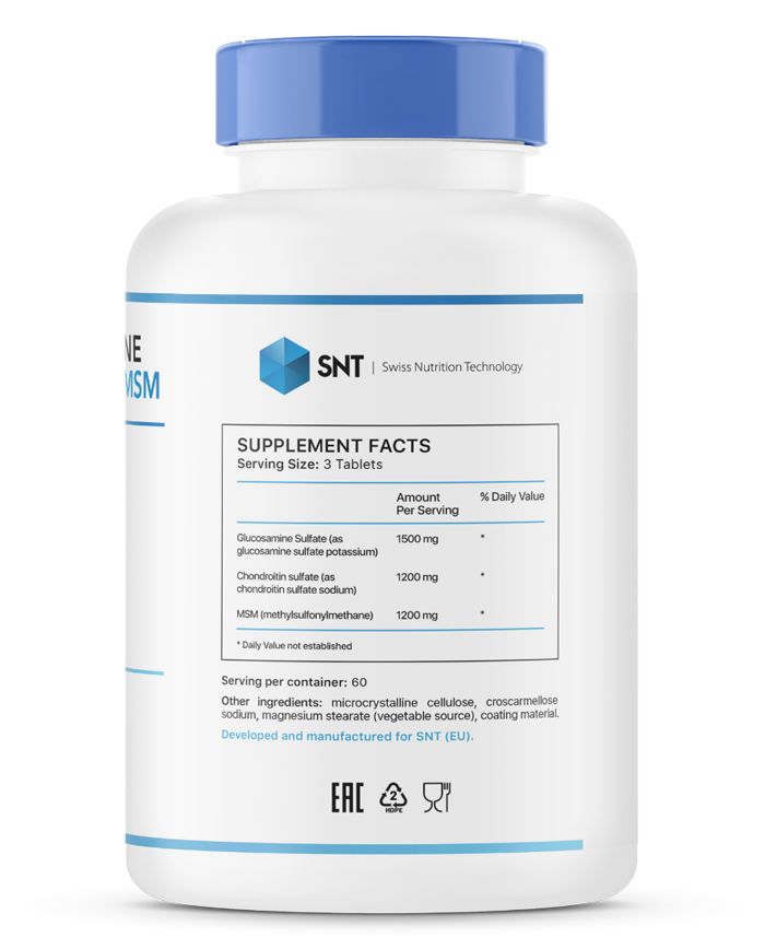 SNT Glucosamine Chondroitin MSM биологически активная добавка к пище, созданная для профилактики и лечения заболеваний опорно-двигательного аппарата. Прием препарата способствует сохранению и восстановлению структурной целостности суставов и соединительных тканей. Снижается риск получения травм на спортивных занятиях, увеличивается подвижность суставов. SNT Glucosamine Chondroitin MSM уменьшает воспалительные процессы, боль в суставах, способствует ускорению восстановления хрящевой ткани после травм.