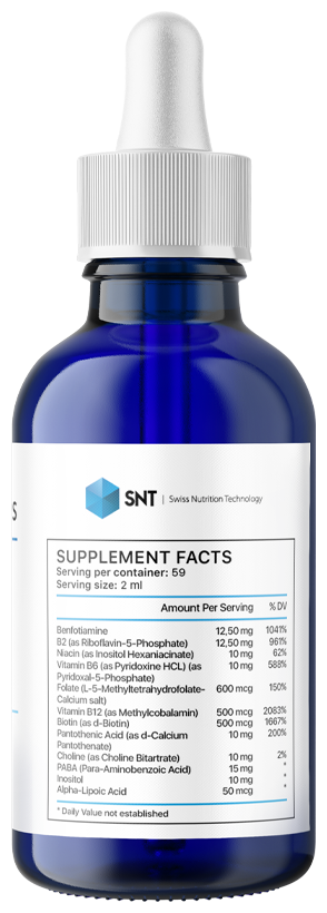 SNT Liquid B Complex - это биологически активная добавка, представляющая комплекс витаминов группы B в удобной жидкой форме. Эти витамины играют ключевую роль в поддержке энергетического обмена, функционировании нервной системы, здоровье кожи и волос, а также общего самочувствия.Жидкая форма обеспечивает высокую биодоступность, позволяя организму быстрее и эффективнее усваивать витамины.