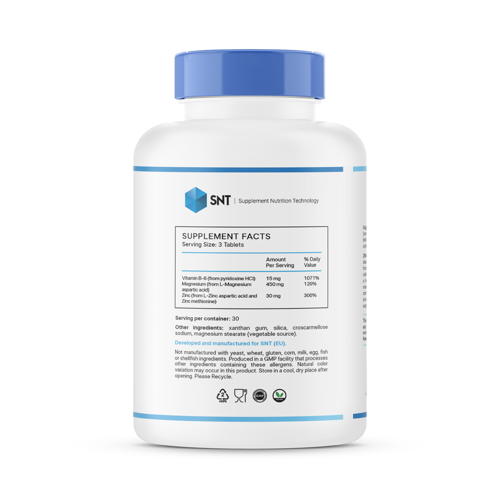 ZMA - комплекс, включающая в себя цинк, магний и витамин B6. Цинк необходим для правильной работы гормональной системы, улучшает выработку тестостерона, укрепляет иммунитет, контролирует жирность кожи. Магний улучшает усвоение цинка, является сильным антиоксидантом, расслабляет нервную систему, играет важную роль в сокращении мышц. Вместе с витамином B6 стимулирует синтез белка в организме.